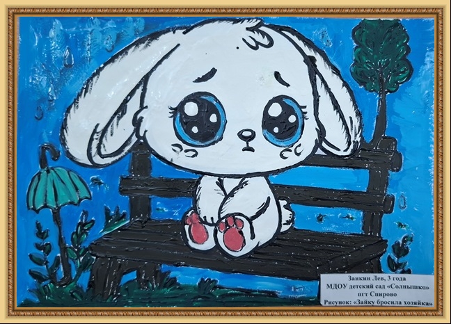 Победитель - Посников Роман (скачать документ), "Зайка мокнет на скамейке", педагоги - Коротовских Анна Владимировна, Сакмарова Ирина Алексеевна, МБДОУ Детский сад №43, здание по адресу пр-т Ленина, д.42а, Челябинская область, Озерский г.о.