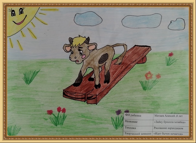 Второе место - Рейх Елизавета (скачать документ), "По мотивам произведения А. Барто Бычок", педагог - Носкова Венера Владимировна, ОУ Частный Детский сад "Гармония детства", Калининградская область, Гурьевский м.о.